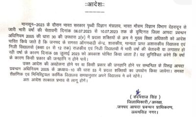 July 7, 2023उधमसिंह नगर : मानसून-2023 के दौरान भारत सरकार पृथ्वी विज्ञान मंत्रालय, भारत मौसम विज्ञान विभाग देहरादून...