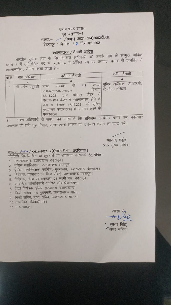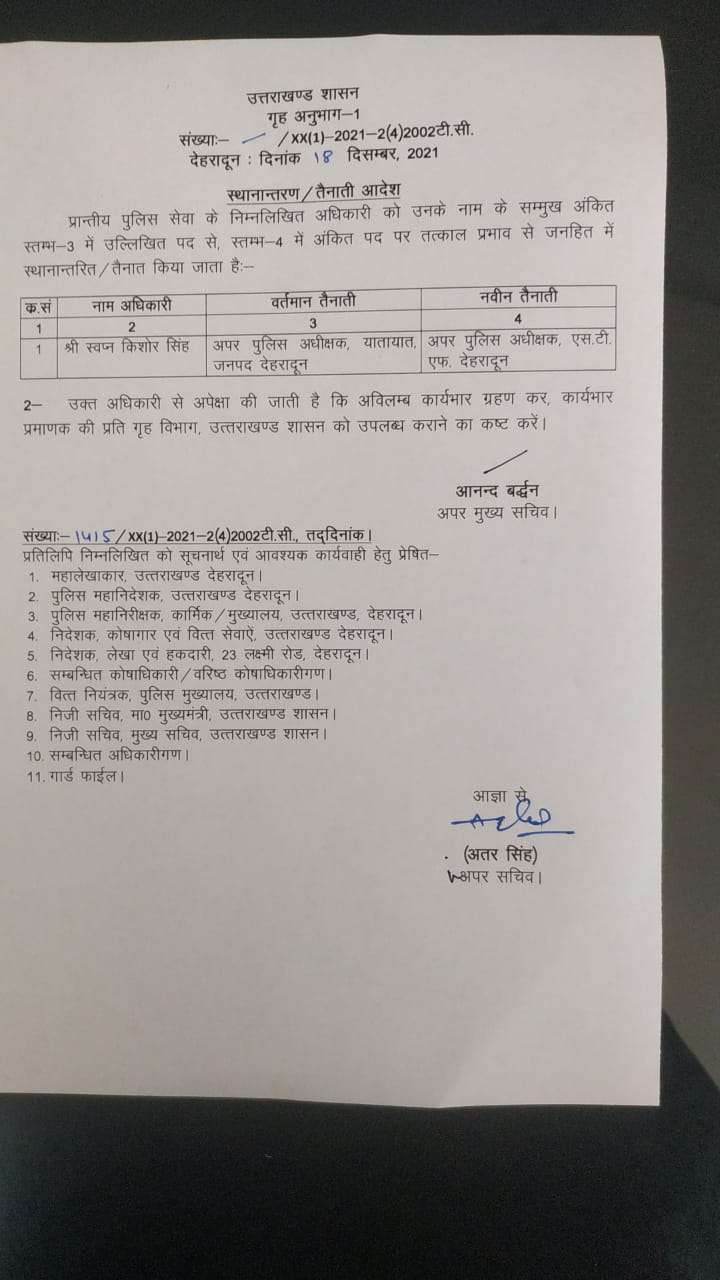 देहरादून: उत्तराखंड में चुनाव से पहले सरकार अपनी टीम बनाने में जुट गई है। शासन ने बड़ी कार्रवाई करते हुए आज (शनिवार) एक आईपीएस और पीपीएस अधिकारी के विभागों में फेरबदल किया है। जिसका आदेश जारी कर दिया गया है। अपर्णा यदुवंशी को पुलिस अधीक्षक जीआरपी रेलवे हरिद्वार की जिम्मेदारी दी गई। तो वहीं पीपीएस अधिकारी स्वपन किशोर सिंह को अपर पुलिस अधीक्षक एसटीएफ देहरादून की जिम्मेदारी सौंपी गई है।