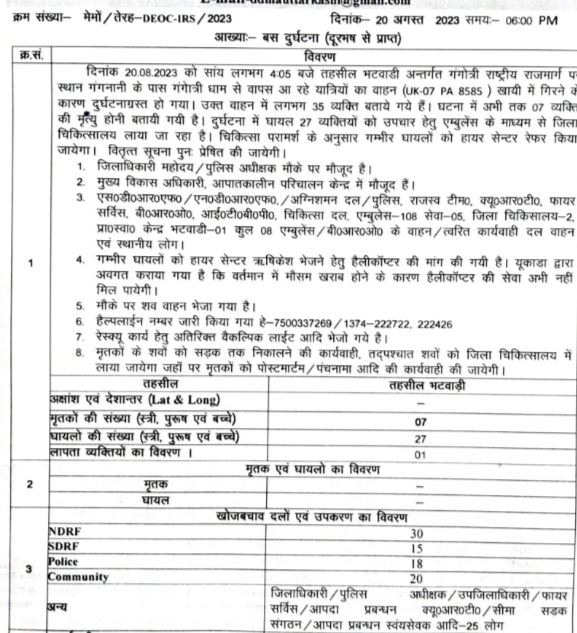 आपातकालीन परिचालन केंद्र उत्तरकाशी द्वारा जारी रिपोर्ट-