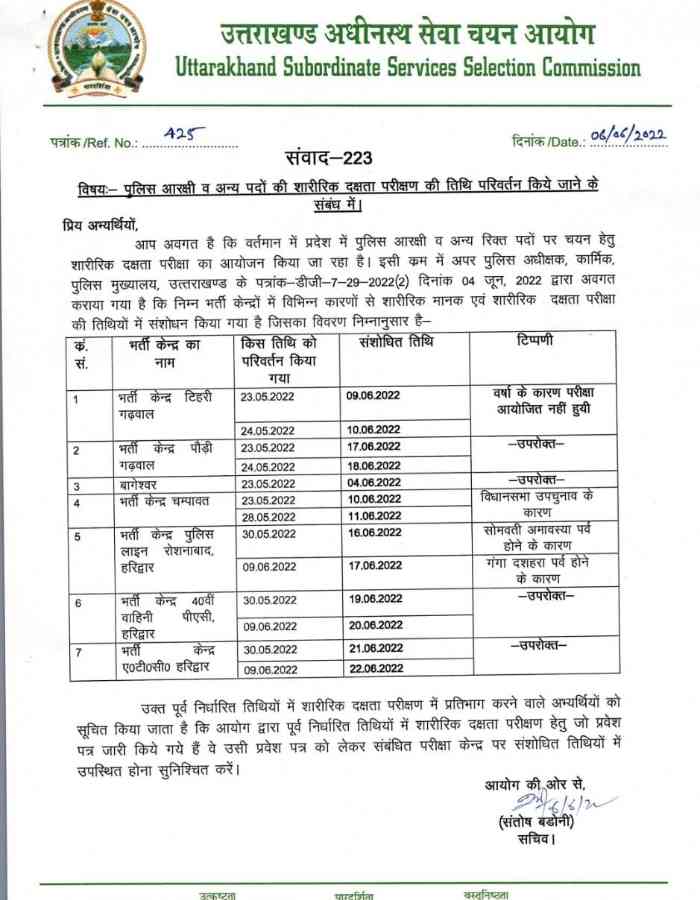 आदेश में लिखा है कि वर्तमान में प्रदेश में पुलिस आरक्षी व अन्य रिक्त पदों पर चयन हेतु शारीरिक दक्षता परीक्षा का आयोजन किया जा रहा है । इसी क्रम में अपर पुलिस अधीक्षक , कार्मिक , पुलिस मुख्यालय , उत्तराखण्ड के पत्रांक- डीजी – 7-29-2022 ( 2 ) दिनांक 04 जून , 2022 द्वारा अवगत कराया गया है कि निम्न भर्ती केन्द्रों में विभिन्न कारणों से शारीरिक मानक एवं शारीरिक दक्षता परीक्षा की तिथियों में संशोधन किया गया है जिसका विवरण निम्नानुसार है।