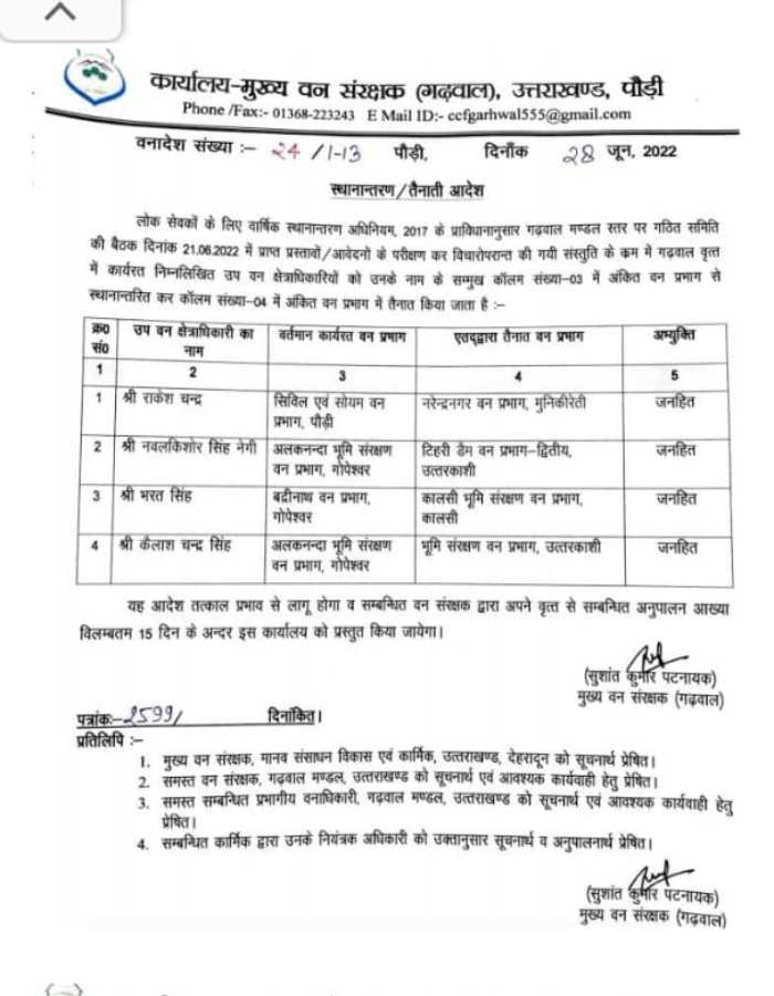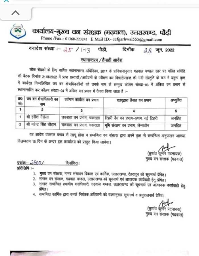 मीडिया रिपोर्टस के अनुसार प्रशासनिक दृष्टिकोण से इन कर्मियों को स्थानान्तरित किया गया है। आदेश में लिखा गया है कि क्षेत्राधिकारी लोक सेवकों के लिए वार्षिक स्थानान्तरण अधिनियम 2017 के प्राविधानानुसार गढ़वाल मण्डल स्तर पर गठित समिति की बैठक दिनांक 21.06.2022 में प्राप्त प्रस्तावों / आवेदनों के परीक्षण कर ये ट्रांसफर किए गए है। हरीश गैरोला को चकराता वन प्रभाग से टिहरी डैम वन प्रभाग – प्रथम , नई टिहरी भेजा गया है। जबकि महेन्द्र सिंह चौहान को चकराता वन प्रभाग से भूमि संरक्षण वन प्रभाग , लैन्सडॉन की जिम्मेदारी दी गई है। इनके साथ ही कई अन्य कर्मियों के ट्रांसफर किए गए है।