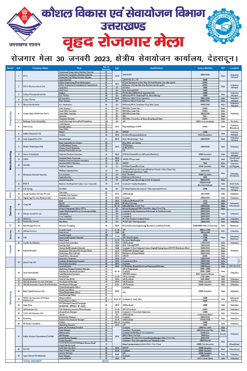 बताया जा रहा है कि रोजगार मेला परेड ग्राउंड के समीप स्थित क्षेत्रीय रोजगार कार्यालय देहरादून में आयोजित होगा। इस मेले में अलग-अलग सेक्टर में काम करने वाली कंपनियां हिस्सा लेने वाली हैं। इनमें से कुछ कंपनियां आईटी, मार्केटिंग, सर्विस, मैन्युफैक्चरिंग, सिक्योरिटी और फार्मा सेक्टर की हैं। जबकि कुछ कंपनियां कस्टमर केयर सर्विसेज में शामिल हैं। इन पदों पर भर्ती के लिए 8वीं से लेकर पीजी तक की शैक्षिक योग्यता रखने वाले उम्मीदवार आवेदन कर सकते है।