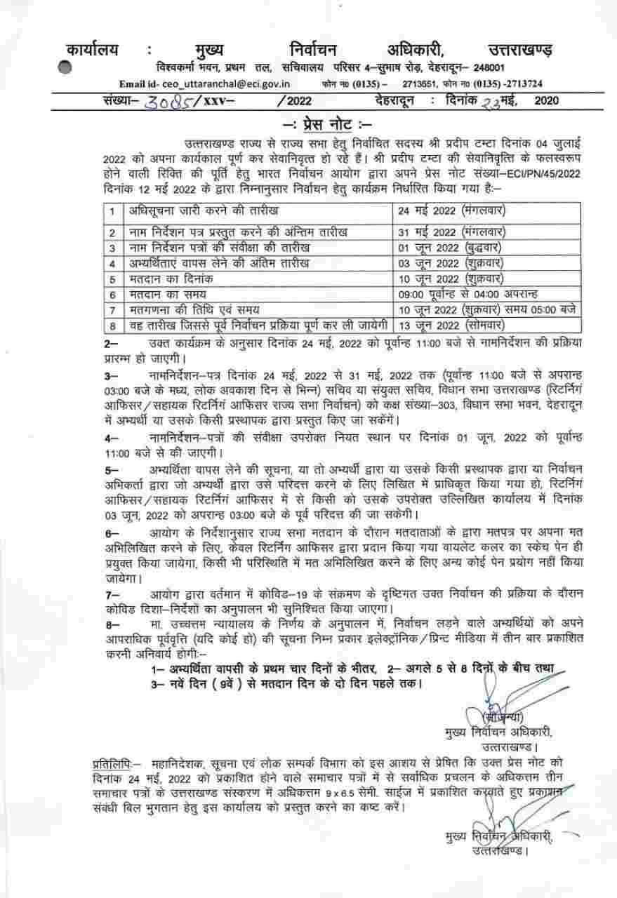 देहरादून: उत्तराखंड से राज्यसभा की रिक्त होने जा रही एक सीट के लिए चुनाव आयोग ने कार्यक्रम जारी कर दिया है। जिसके अनुसार 10 जून को मतदान होगा। नामनिर्देशन–पत्र के लिए 24 मई, 2022 से 31 मई, 2022 तक समय है। बताया जा रहा है कि राज्यसभा चुनाव के मद्देनजर प्रदेश भाजपा ने दावेदारों के नाम का पैनल तैयार कर लिया है।