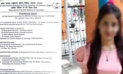 Ankita Bhandari Murder Case: प्रोविशनल पोस्टमार्टम रिपोर्ट आई सामने, मौत की ये है वजह, पढ़ें…