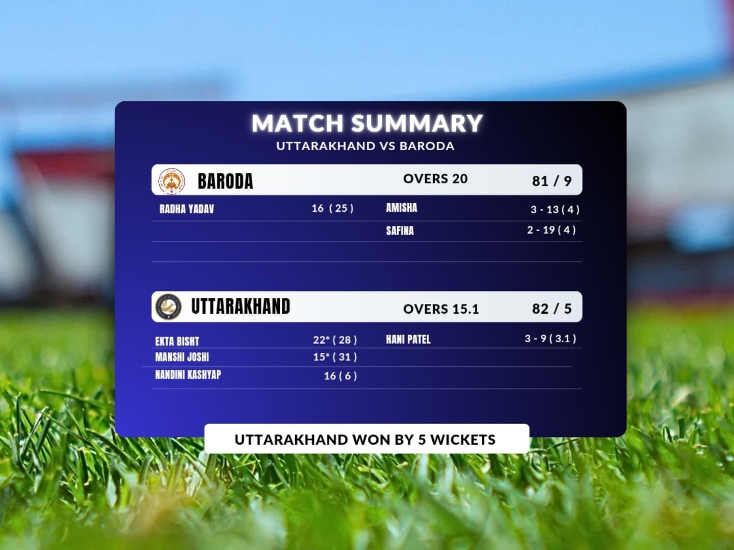 मैच में पहले बल्लेबाजी करने उतरी बढ़ौदा की टीम ने 20 ओवर में 9 विकेट के नुकसान पर 81 रन बनाए। उत्तराखंड की और से अमीषा ने 03 और सफीना ने दो विकेट लिए। जीत के लिए 82 रन का टारगेट लेकर मैदान में उतरी उत्तराखंड की टीम ने 15.1 ओवर में 5 विकेट खोकर ही जीत हासिल कर ली। उत्तराखंड टीम की तरफ से एकता बिष्ट ने नाबाद 22 और मानसी जोशी ने नाबाद 15 रनों की पारी खेली नंदिनी कश्यप ने 16 रन की पारी खेली। इस जीत के साथ ही उत्तराखंड की टीम लगातार दूसरी बार सीनियर महिला टी20 ट्रॉफी के सेमीफाइनल में पहुंची है।