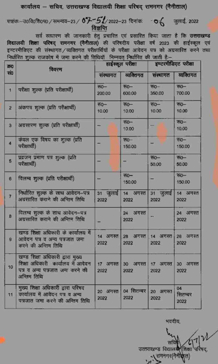 उत्तराखंड विद्यालय शिक्षा परिषद रामनगर नैनीताल ने परिषदीय परीक्षा वर्ष 2023 की हाईस्कूल एवं इंटरमीडिएट परीक्षा आवेदन पत्र जमा करने की तिथि व शुल्क निर्धारित कर दी है।