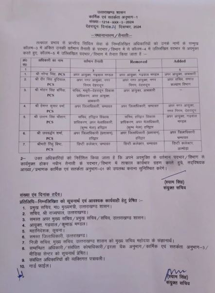 तत्काल प्रभाव से प्रान्तीय सिविल सेवा के निम्नलिखित अधिकारियों को उनके नामों के सम्मुख कॉलम-3 में अंकित उनकी वर्तमान तैनाती के पदभार / विभाग में से कॉलम-4 में उल्लिखित पदभार से अवमुक्त करते हुए, कॉलम-5 में उल्लिखित पदभार / विभाग में तैनात किया जाता है: